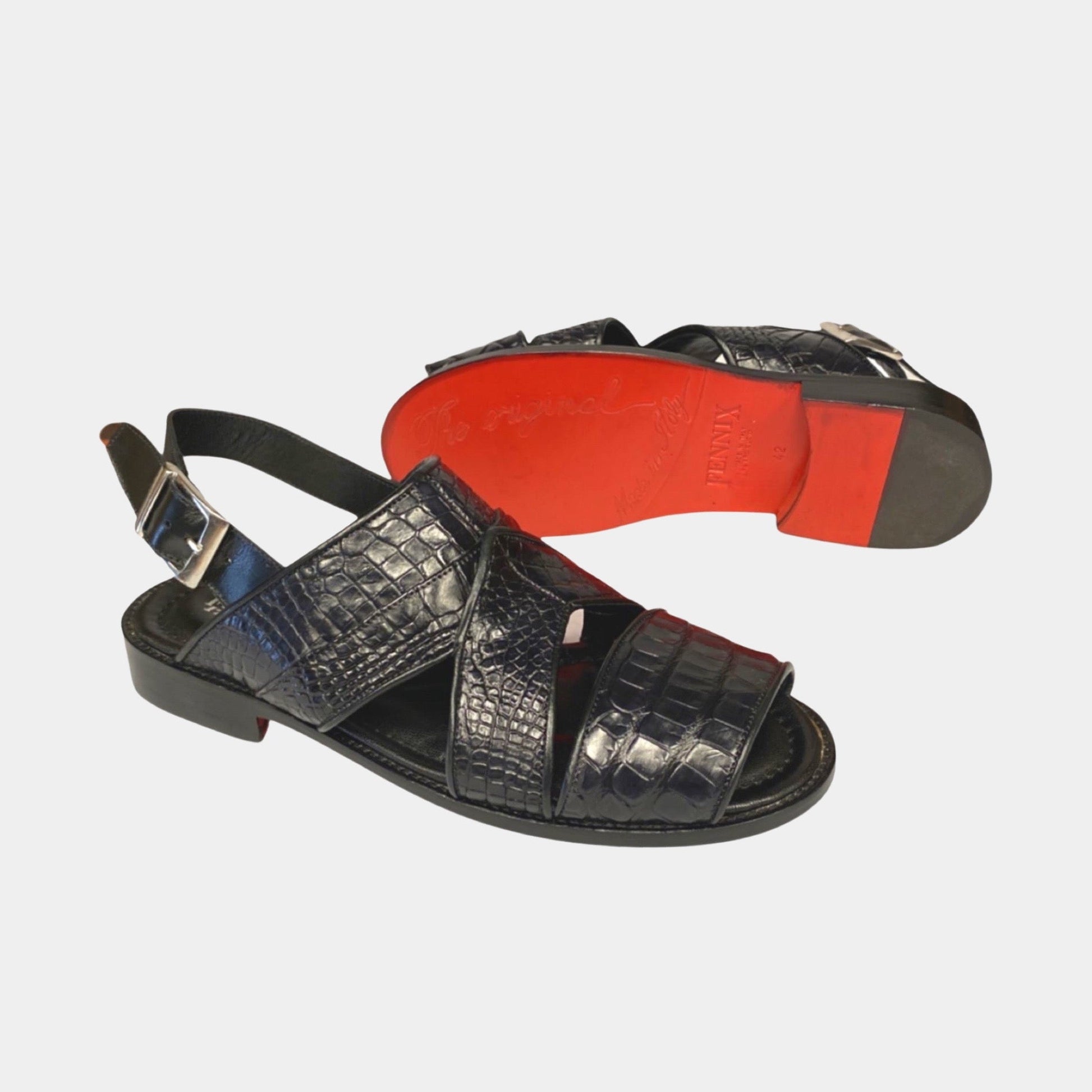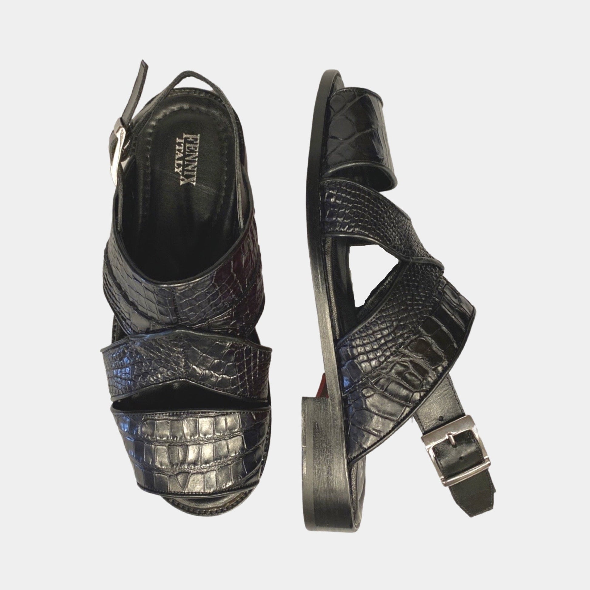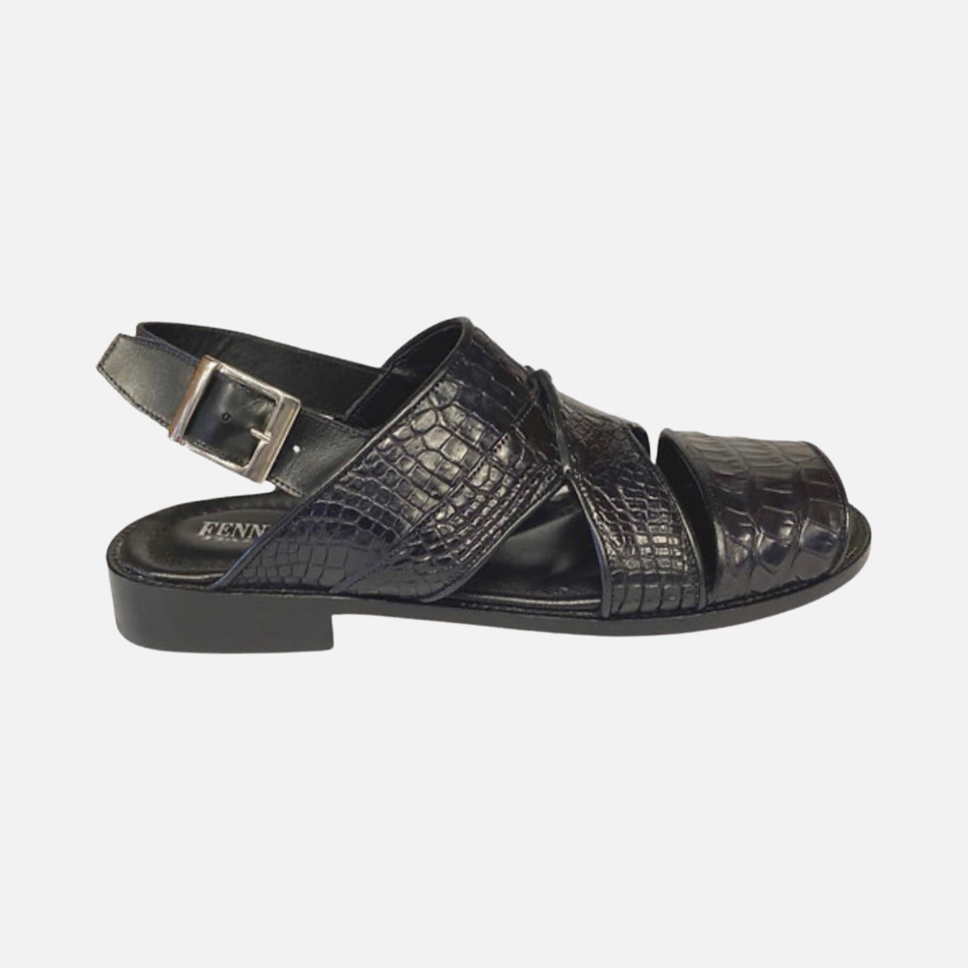 Introducing the ultimate statement piece for the fashion-forward gentleman by Fennix - the HAROLD black alligator sandals. Crafted from the finest alligator leather, these shoes feature a stunning hand-painted finish that highlights the unique texture and pattern of the skin.