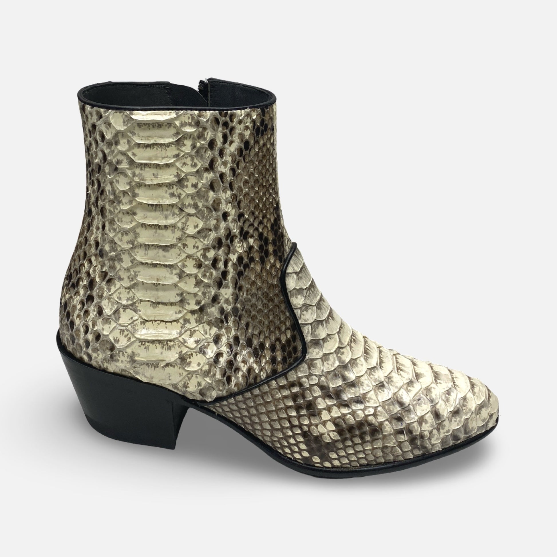 Mens Lost Altos Cuban heel style python dressy boot with side zip.
